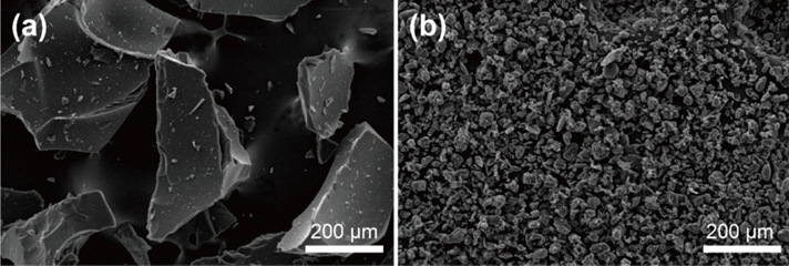 그림 2(a), (b)는 200배의 배율에서 얻은 HC와 AG의 SEM 이미지이다. HC와 AG의 평균 입자 크기는 각 약 168 µm과 약 17 µm로, HC의 평균