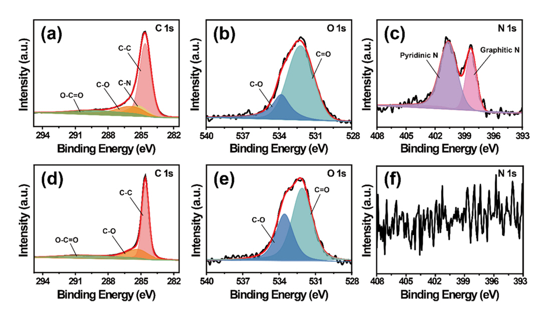 그림 4는 XPS spectra 분석으로, HC와 AG 표면의 원자 결합 상태를 나타낸 결과이다. 그림 4(a-c)는 HC를, 그림 4(d-f)는 AG의 XPS spectra이며, HC와 AG 모두 C 1s, O 1s, N 1s의 피크를 분석하였다. 그림 4(a)와 (d)에 제시된 바와 같이 HC와 AG 모두 C-C 결합이 주를 이루고 있으며 HC의 경우, N 1s 피크가 나타나 HC 표면에 질소 원자가 존재함을 알