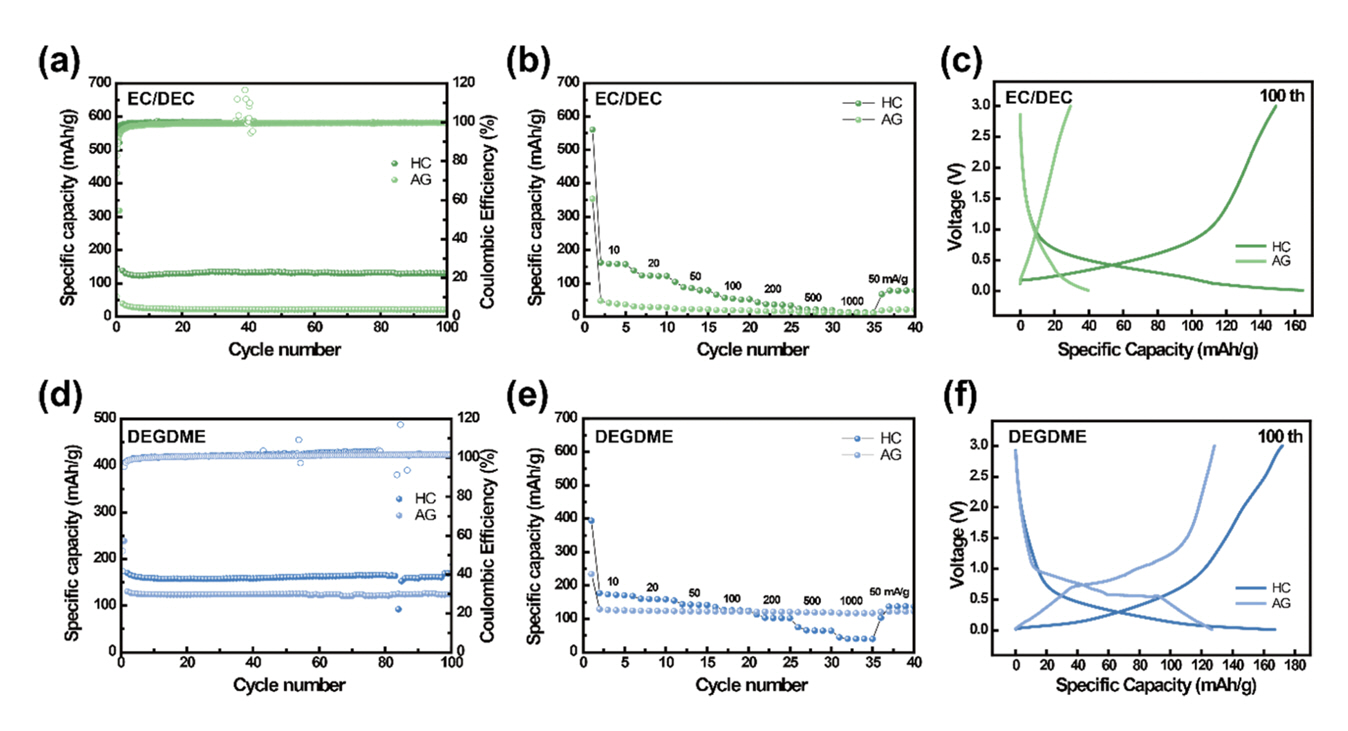 전기화학적 성능 분석에서 전반적으로 EC/DEC 전해질과는 다르게 AG는 높은 용량을 보였는데, 이는 DEGDME 전해질이 소듐 이온과 흑연 사이의