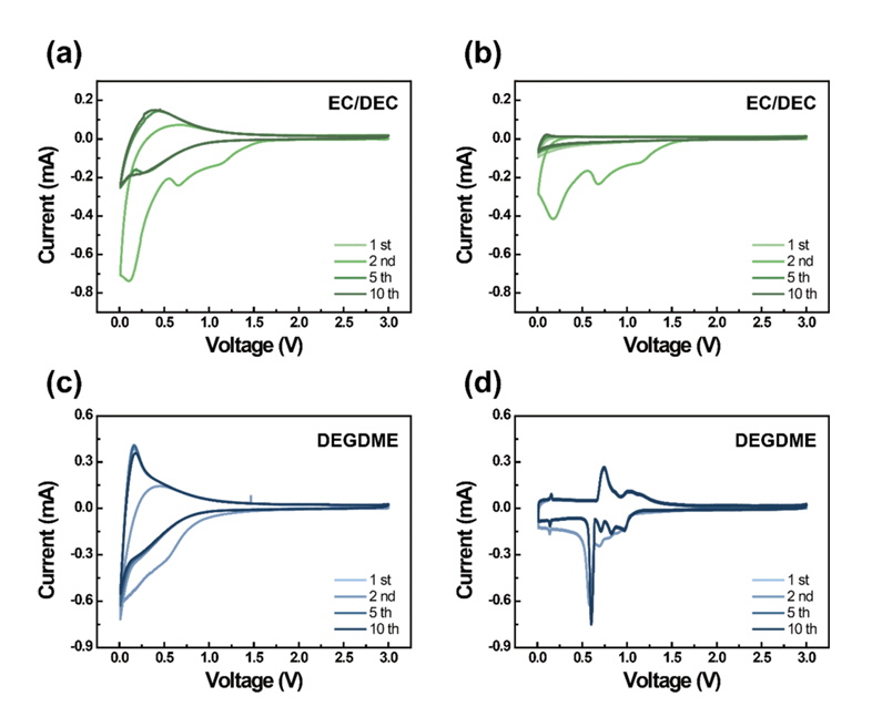 그림 6(c)와 (d)에서는 DEGDME 전해질을 사용한 HC와 AG 전극의 CV 곡선을 각각 나타냈다. HC의 경우, 0.01-0.16 V의 전압 범위에서 sharp한