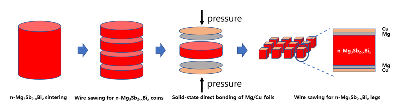n형 Mg3Sb2-xBix 소재와 오믹접합층을 분말상태에서 시작하여 한 번의 소결로 동시에 형성하는 것이 아니라 그림 2와 같이 먼저 n형 Mg3Sb2-xBix 소재를 합성하고 원하는 두께의 코인으로 가공한 후 그 상하부에 금속박을 고상접합(solid-state bondng)함으로써 열전레그의 높이와 오믹접합층의