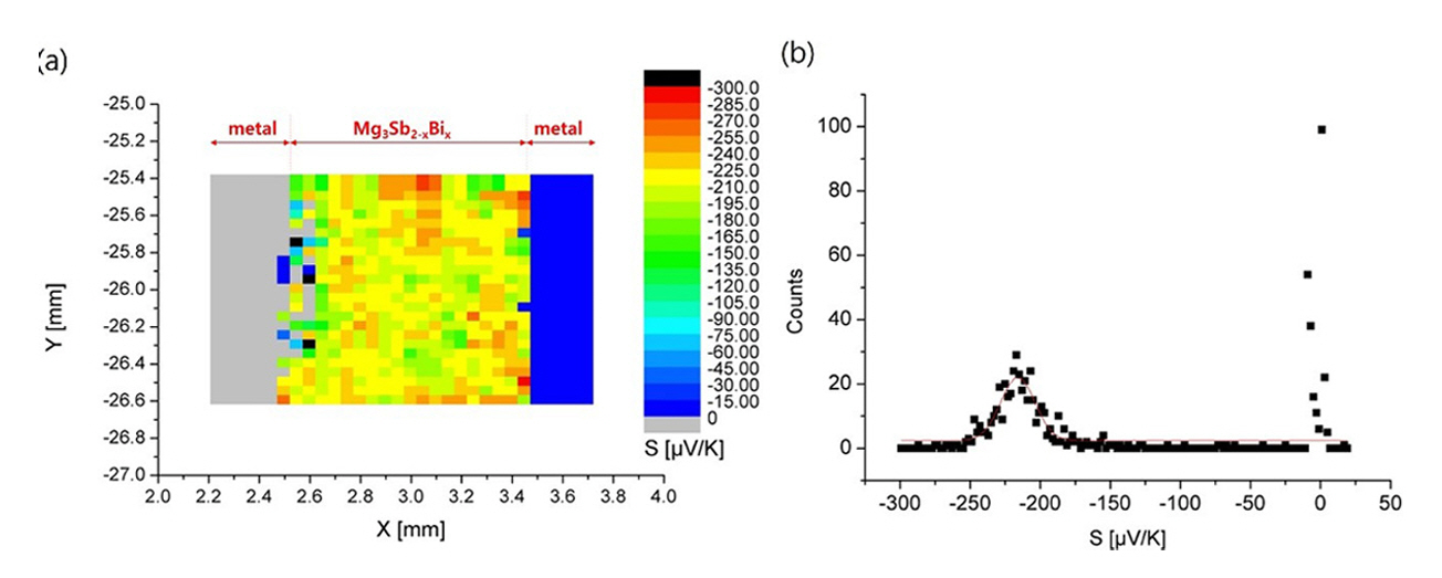 (a) A two-dimensional map for Seebeck coefficient of a metallized Mg3.45Mn0.05Sb1.5Bi0.48Te0.02 leg (solid-state bonding at 723 K), and (b) the abundance distribution of Seebeck