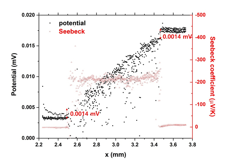 그림 8은 723 K에서 고상접합된 Mg3.45Mn0.05Sb1.5Bi0.48Te0.02 레그의 단면에 대하여 접합계면에 수직방향으로 PSM을 line scan하여 전압과 제벡계수를 측정한 결과를 표시한 그래프이다. 제벡계수가 거의 0에