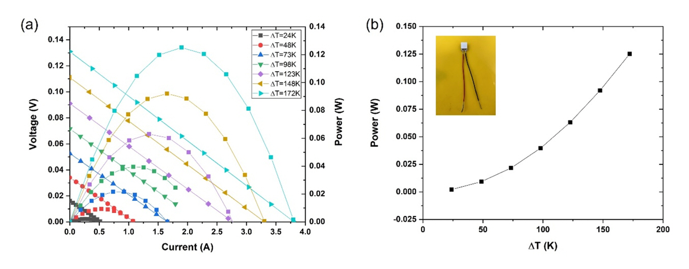 온도를 298 K로 고정하여 냉각하면서 반대쪽의 온도를 높여 온도차 24-172 K의 구간에서 출력을 측정하였으며, (a)에서 모듈에 흐르는 전류에