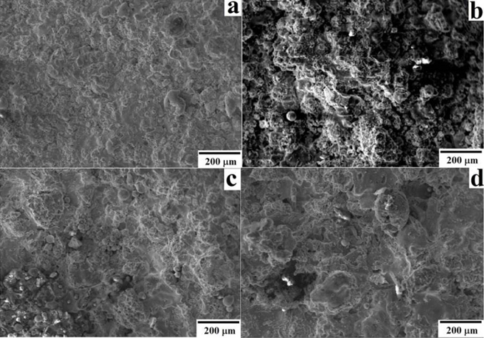 : (a) 100% Gd2O3 (b) 50%Gd2O3-Ni5%Al (c) 25%Gd2O3-Ni5%Al (d) 10%Gd2O3-Ni5%Al