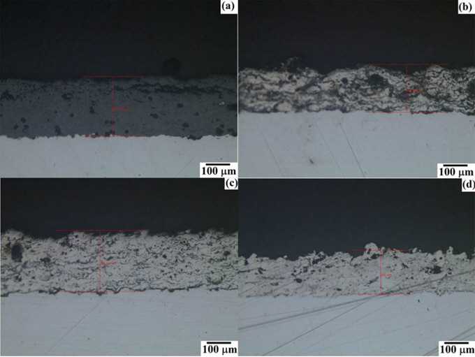 dispersive spectroscopy, Bruker, USA)를 사용하여 수행되었다. 도포층의 두께는 에폭시 마운팅하고 연삭한 후 금속 현미경(Olympus