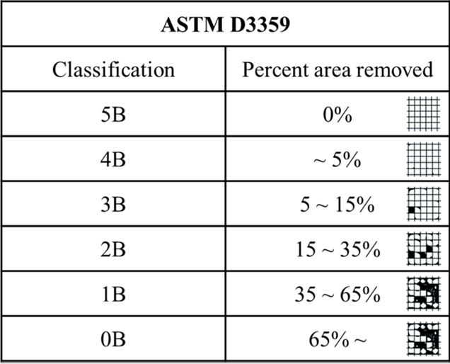 ๊ธฐ์ง์ ์ฐํ์ธต ๊ฐ์ ์ ํฉ์ฑ์ ํ๊ฐํ๊ธฐ ์ํด ASTM D3359 ๊ท๊ฒฉ์ ๋ฐ๋ผ cross cut test์ tape test๋ฅผ ์ํํ์๋ค. Dorco์ฌ์