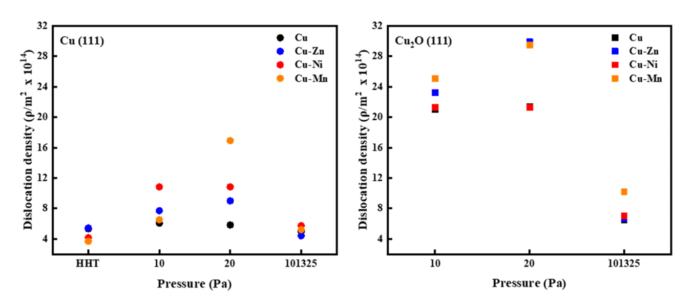 (20 Pa ๋ฐ 10 Pa)์์ Cu2O๋ง์ด ํ์ธ๋์์ผ๋ฉฐ, ๋๊ธฐ์ (101,325 Pa)์์ ํ์ฑ๋ ์ฐํ์ธต์ Cu2O๋ฟ๋ง ์๋๋ผ CuO๋ ํจ๊ป ํ์ฑ๋ ๊ฒ์ผ๋ก ๋ํ๋ฌ๋ค. ๊ตฌ๋ฆฌ ํฉ๊ธ(Cu-Zn, Cu-Ni, Cu- Mn)์ ๊ฒฝ์ฐ์๋ ๊ตฌ๋ฆฌ์ ๋์ผํ๊ฒ 20 Pa ๋ฐ 10