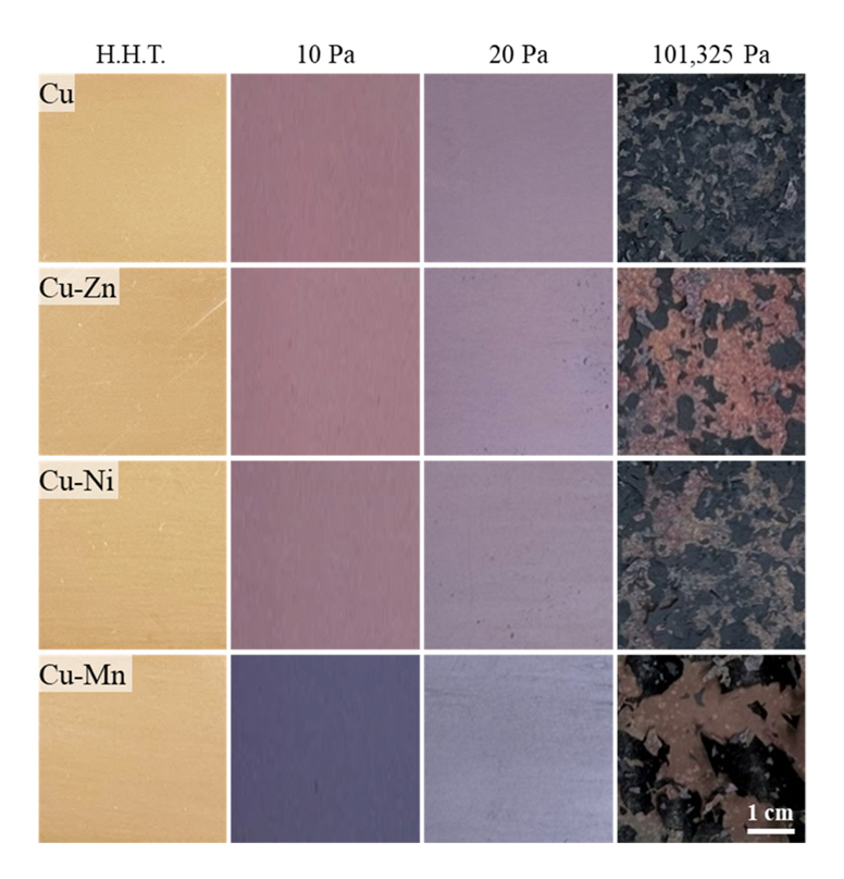 ํฉํ์ฌ ๋ํ๋๋ค. Cu, Cu-Zn ๊ทธ๋ฆฌ๊ณ Cu-Mn ํฉ๊ธ์ 10 Pa์ 20 Pa์์ ๋ฐ๋ฆฌ๊ฐ ๋ฐ์ํ์ง ์๋ ์์ ํ ์ฐํ์ธต์ด ํ์ฑ๋์์ง๋ง, Cu-Ni