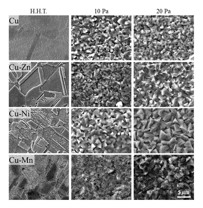 ๊ทธ๋ฆผ 4๋ Cu ๋ฐ Cu-Zn, Cu-Ni, Cu-Mn ํฉ๊ธ์ ๊ท ์งํ ์ฒ๋ฆฌํ ํ์ ๋ฏธ์ธ์กฐ์ง๊ณผ 20 Pa ๋ฐ 10 Pa์์ 700ยฐC๋ก 60๋ถ ๋์ ํ์ฑ๋