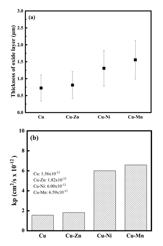 ๊ทธ๋ฆผ7-(b)์ 10 Pa์์ 700ยฐC๋ก 60๋ถ ๋์ ํ์ฑ์ํจ ์ฐํ์ธต์ ๋ํ ํฌ๋ฌผ์ ์ฑ์ฅ ์์๋ฅผ ๋ํ๋๋ค. Cu๋ 1.56 ร 10-12 cm2/s, Cu-Zn๋ 1.82 ร 10-12 cm2/s, Cu-Ni์ 6.00 ร 10-12cm2/s, Cu-Mn์ 6.59 ร 10-12cm2/s๋ก ๊ณ์ฐ๋์๋ค. ๊ตฌ๋ฆฌ์ ๋นํด ๊ตฌ๋ฆฌ ํฉ๊ธ์์ ๋ ๋์ ๊ฐ์ ๊ฐ์ง๋ฉฐ, ํนํ Cu-Mn ํฉ๊ธ์์ ๊ฐ์ฅ ๋๊ฒ ๋ํ๋ฌ๋ค.