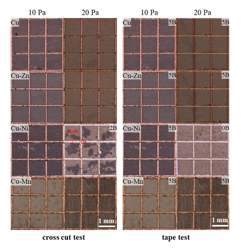 ์ ๊ธฐ์์์ ํ์ฑ๋ ์ฐํ์ธต์ ์์ ์ฑ์ ํ๊ฐํ๊ธฐ ์ํด ๊ธฐ์ง์์ ์ ํฉ์ฑ์ ๋ถ์ํ์๋ค. ๊ทธ๋ฆผ 9๋ 20 Pa ๋ฐ 10 Pa์์ 700ยฐC๋ก 60๋ถ ๋์ ํ์ฑ๋ ๊ตฌ๋ฆฌ ๋ฐ ๊ตฌ๋ฆฌ ํฉ๊ธ ์ฐํ์ธต์ ์ ํฉ์ฑ์ ASTM D3359 ๊ท๊ฒฉ์ ๋ฐ๋ผ ํ๊ฐํ ๊ฒฐ๊ณผ๋ฅผ