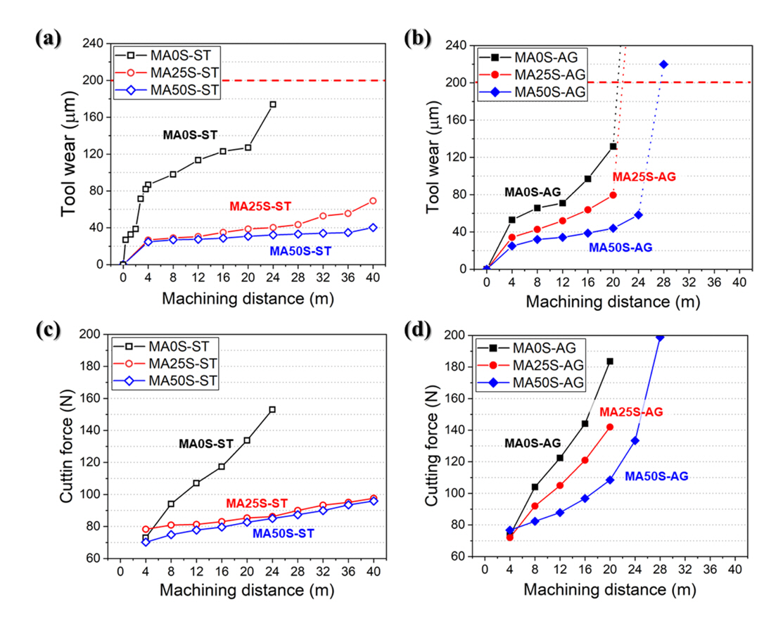 The change of (a-b) tool wear and (c-d) cutting force with the machining distance: