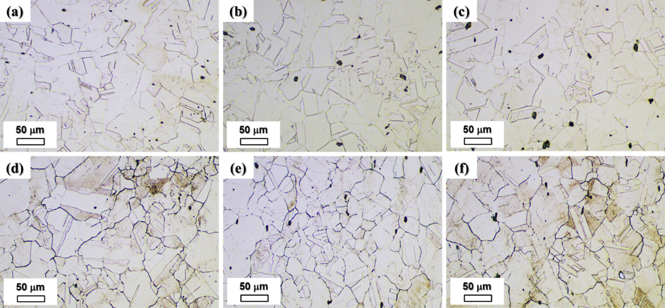Optical micrographs of the microstructure (a-c) before and (d-f) after aging treatment: