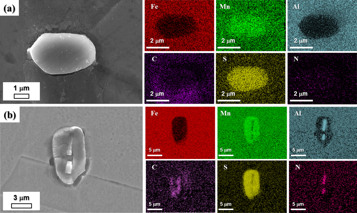 FE-SEM micrographs with EDS mapping analysis of (a) MnS and (b) AlN-MnS inclusions.