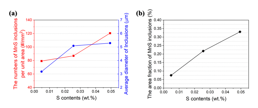 inclusions and (b) the change of area fraction of MnS inclusions depending on S contents.