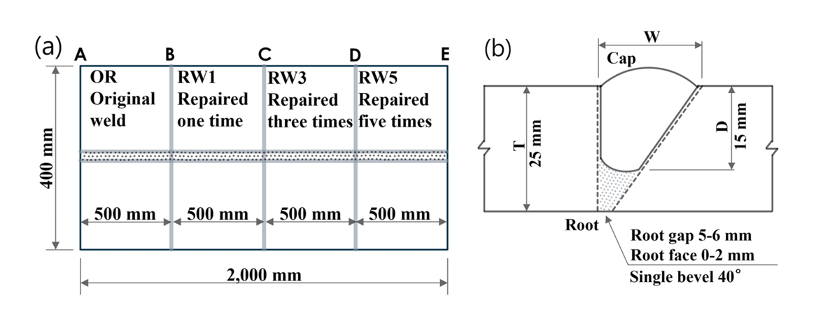 그림 1a는 맞대기 용접 시험재 크기와 수정 용접 횟수를 나타낸다. 용접은 수직상진(3G-up) 자세를 적용하여 A에서 E방향으로 용접하고 수정 용접의 횟수에