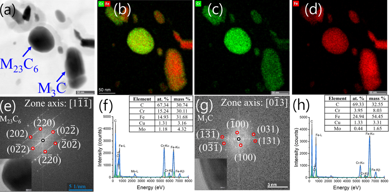 열역학적 소프트웨어 Thermo-Calc로 평형상태도 상에서 석출 거동을 예상하였다. 또한 미세 석출물의 종류, 분포 그리고 크기는 탄소 레플리카법으로