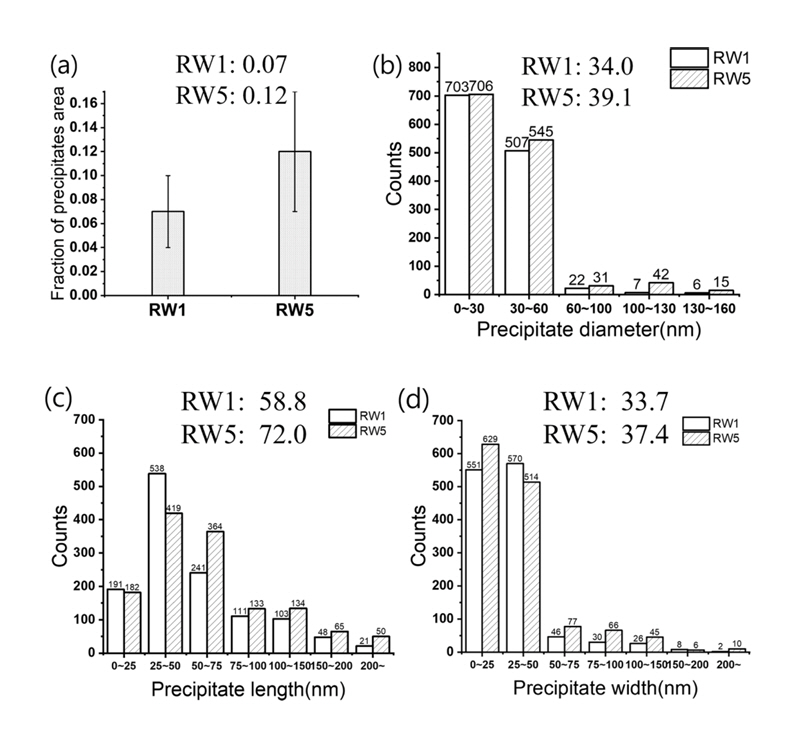 분석하였다. 석출물은 명확하게 보이는 결정립 경계를 포함하여 50,000배 배율의 이미지 18개에서 Image-Pro를 사용하여 석출물의 분포와 크기를