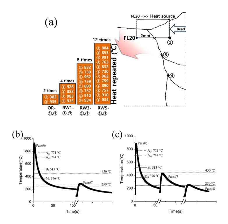 그림 5a는 OR, RW1, RW3 및 RW5의 수정 용접 횟수에 따라 FL20이 위치 ①과 ③의 열원으로부터 받는 AC1–AC3 온도 이상의 열영향 반복 횟수(number of thermal cycles; NTC)와 온도를 나타낸다. OR은 위치 ③의 Tp 935°C로 1차 열영향을 받고 위치 ①의 Tp 983°C로 2차 열영향을 받았으며, RW1, RW3 및 RW5는 수정 용접 횟수 1, 3, 5에 따라 4차, 8차, 12차의 열영향이 반복적으로