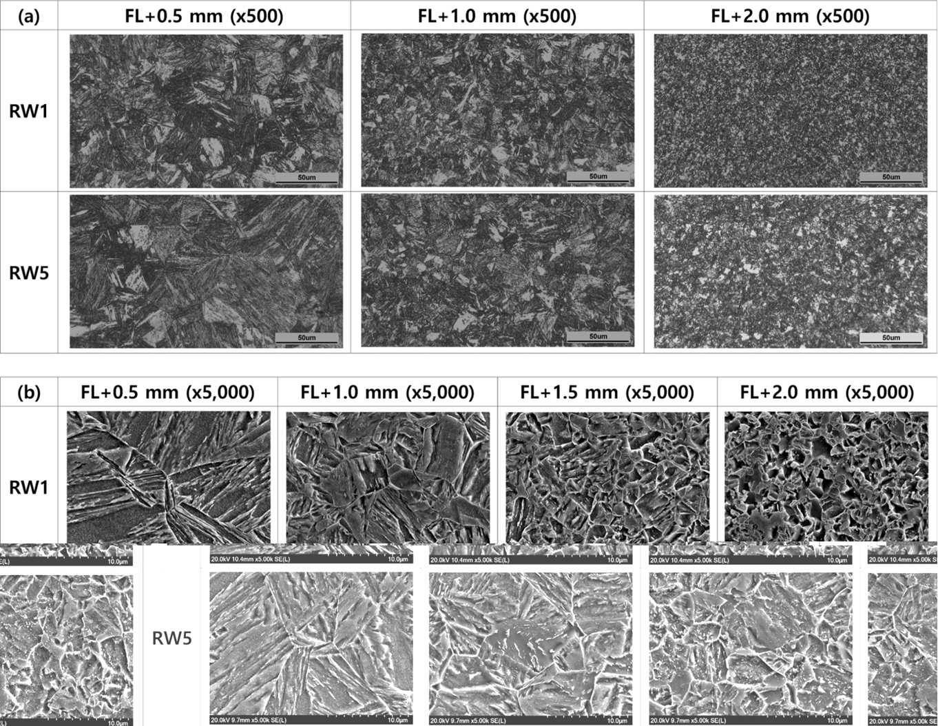 HAZ의 미세조직은 RW1과 RW5의 FL20에서 정밀 분석하였다. 미세조직을 LOM으로 분석하기 위하여 ASTM E407에 따라 #400–2400