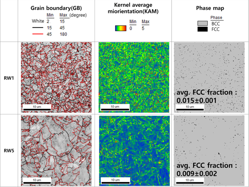 각 5회씩 측정하고, OR과 RW1은 각각 339 포인트 RW3와 RW5는 196, 188 포인트의 평균값을 계산하였다. 후방산란전자회절(electron