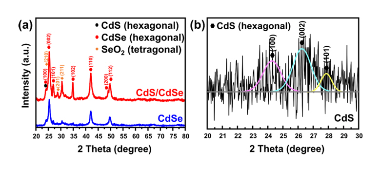 그림 2(a)는 CdSe와 CdS/CdSe 광양극의 XRD 분석 결과를 보여준다. CdSe와 CdS/CdSe 광양극에서 확인된 23.9°, 25.4°, 27.1°,