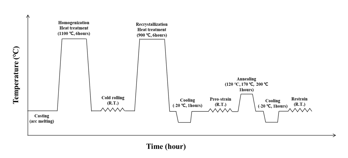 확인하고자 하였다. 본 연구에서 치유처리는 다음과 같이 수행되었다: 1. 냉간 압연 및 재결정 열 처리를 통한 합금 준비; 2. 기계적 특성을 평가하기