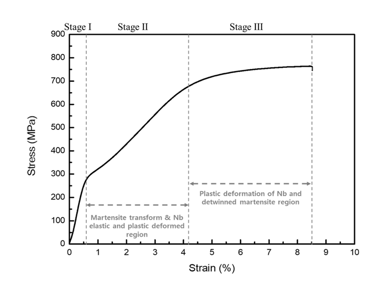 수 있다. Stage I은 쌍정 마르텐사이트 및 β Nb의 탄성 변형 영역, Stage II은 탈쌍정 마르텐사이트로 전이 및 β Nb의 탄성 및 소성