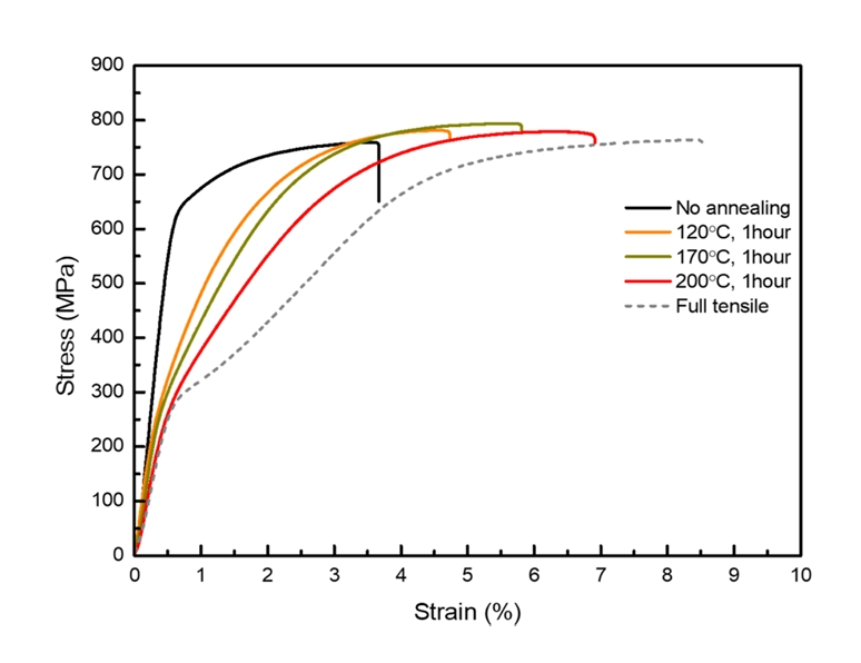 완전히 완료되었다고 판단되는 변형율 4%, 응력 600 MPa까지 사전 변형 후 치유 열처리를 진행하였다.