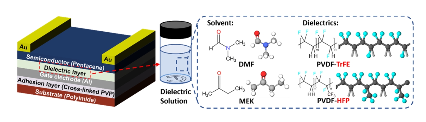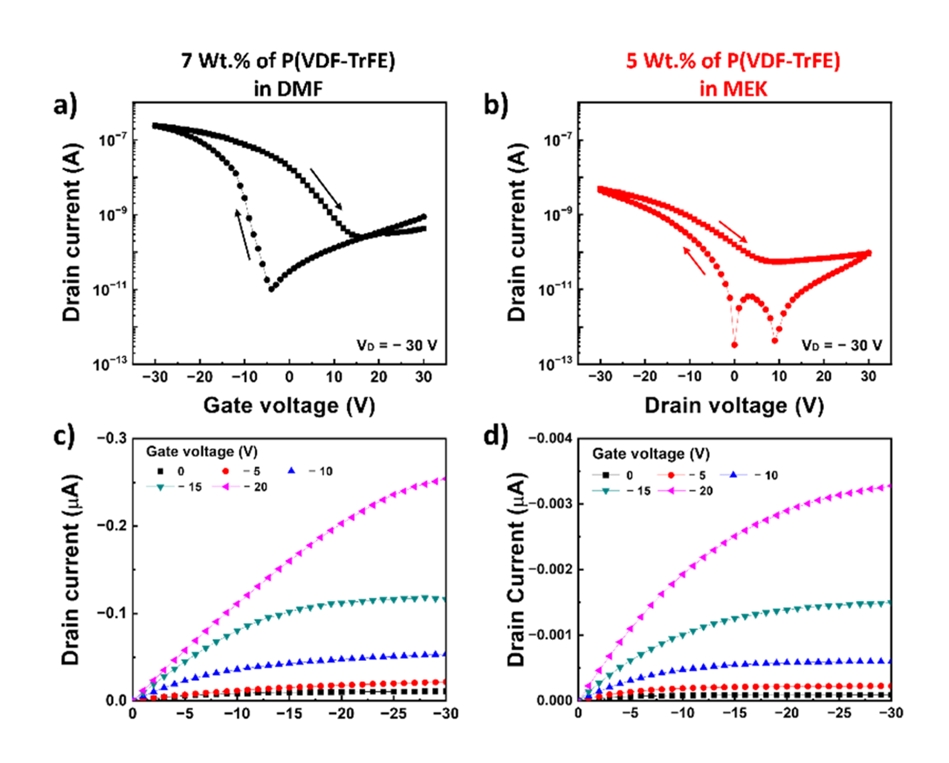 from the DMF and MEK solvents. The extracted memory window (ΔVth) and drain currents of the P(VDF-HFP) with DMF were 25.1 V and 0.025 μA and 15.0