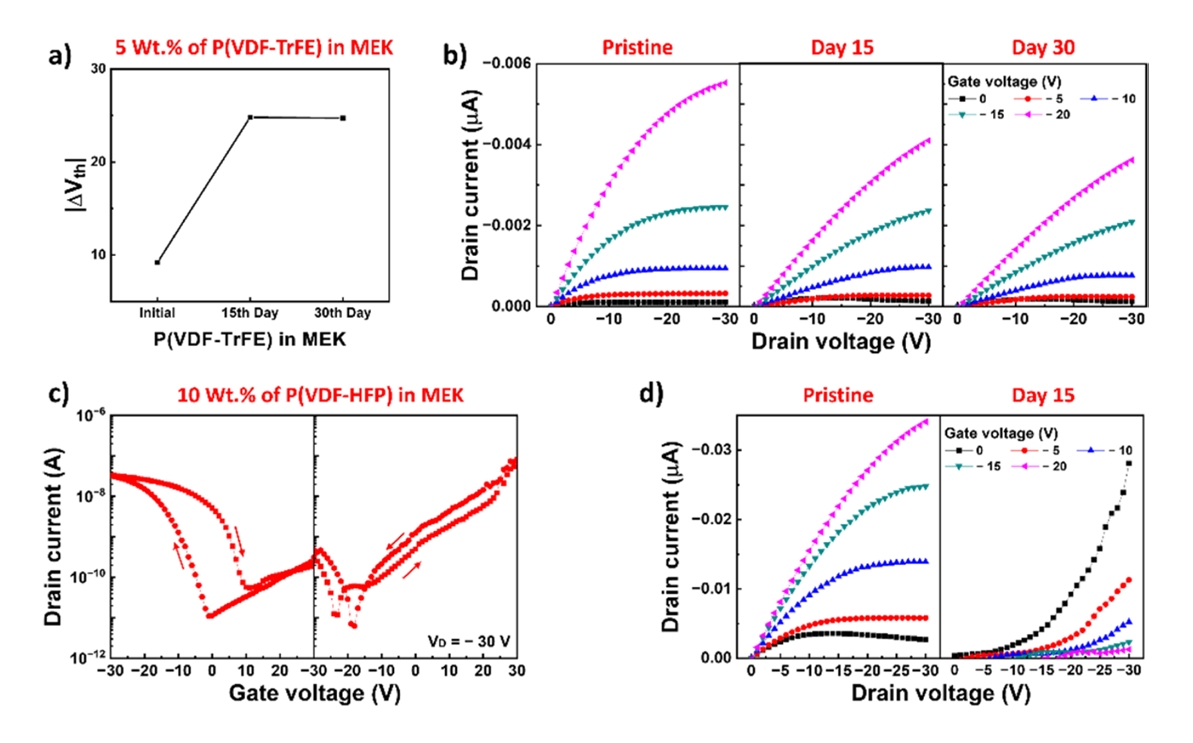in window size with time, and the extracted ΔVth after one month was 20.4 V. For the device with the P(VDF-HFP) dielectric, ΔVth decreased from 25.1 to 19.0 V after two weeks. The obtained results demonstrate that