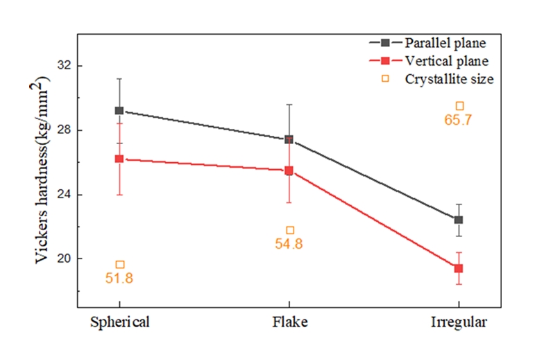 ์ฆ๊ฐ ๋๋ ๊ฐ์๊ฐ ์๋ก ์ผ์นํ๋ค[26]. ๋ฐ๋ผ์ ๊ฒฐ์ ์ ํฌ๊ธฐ๋ ๊ตฌํ, ํ์ํ ๊ทธ๋ฆฌ๊ณ ๋ถ๊ท์นํ ์์ผ๋ก ์ฆ๊ฐํ๊ธฐ ๋๋ฌธ์ Hall-petch์์ ์๊ฑฐํ์ฌ ๊ฒฝ๋๋ ๋ถ๊ท์นํ, ํ์ํ, ๊ทธ๋ฆฌ๊ณ