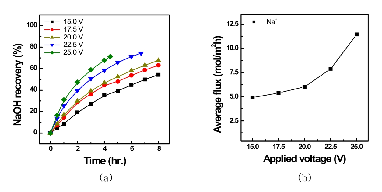 바람직하지 않다. 반면에 15 V 조건에서는 염기 회수율이 54.37%로 다른 조건들에 비해 비교적 낮은 회수율을 보였다. 이는 15 V는 Na+가 양이온 교환막을 넘어가기에 충분하지 않은 전압이기 때문으로 판단된다. 그림 3(b)는 각 조건에서의 Na+의 플럭스를 나타낸 것으로 인가전압이 증가할수록 Na+의 플럭스도 증가하였다. 특히 25 V 조건에서는 11.43 mol/m2h로 가장 높았다. 이는 25 V 조건에서의 실험 온도가 높았고, 실험 시간이 다른 조건들에 비해 짧았으며, 평균전류가 2배 이상 높았기 때문으로