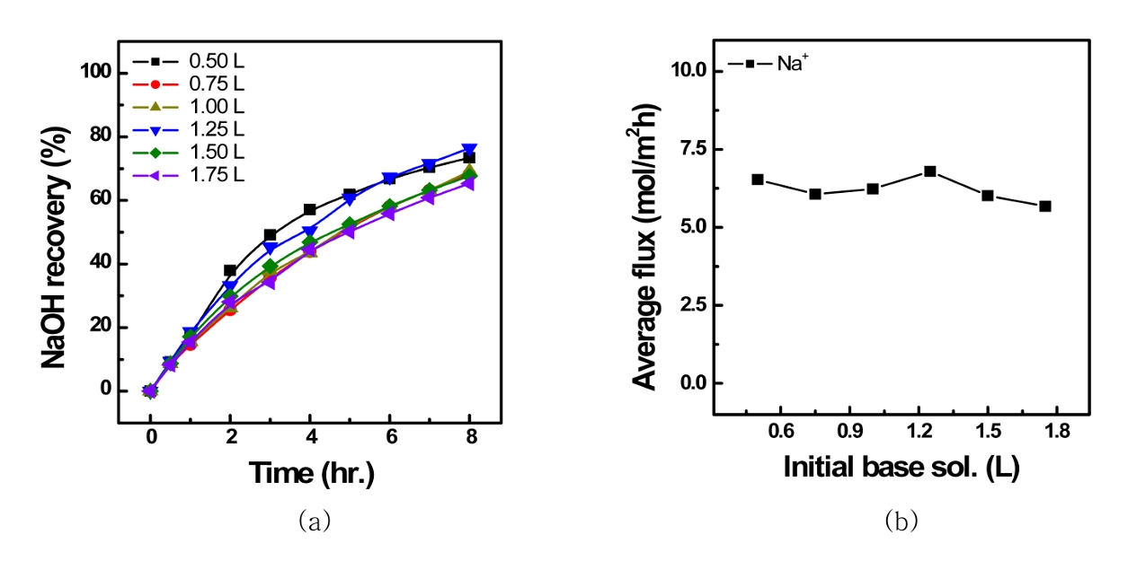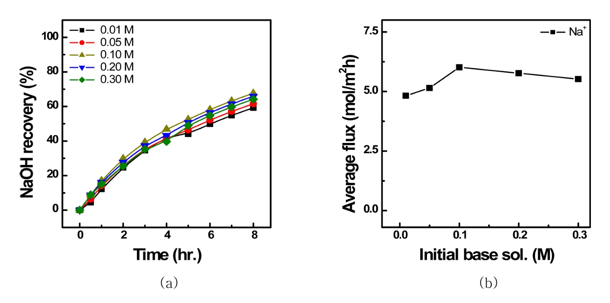 회수율 및 Na+의 플럭스가 감소하기 때문에 염기의 회수 농도를 높이기 위해 초기 염기의 농도를 조절하는 것은 바람직하지 않다고 판단된다.