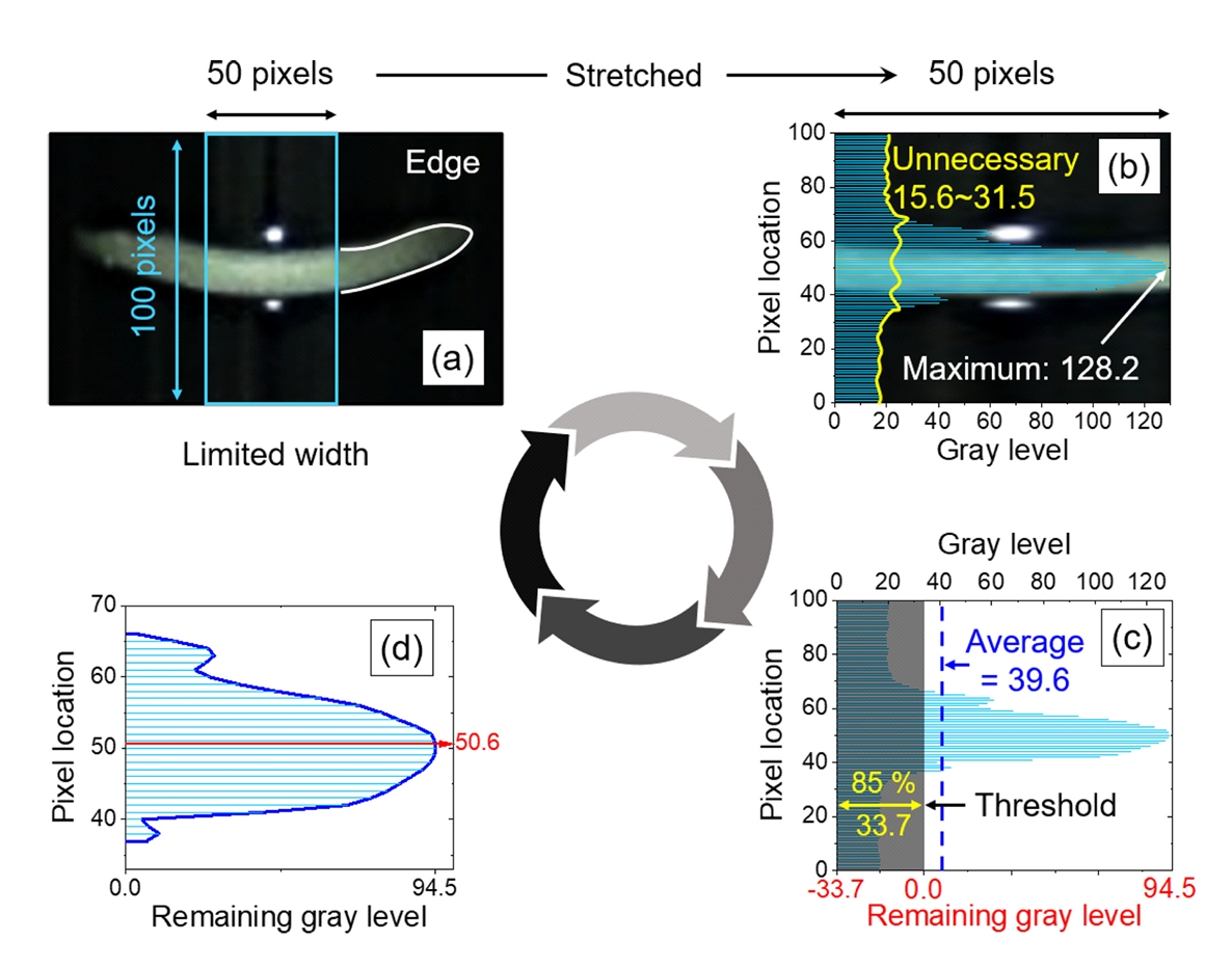 카메라를 이용한 초승달 형상의 수위의 밝기의 위치를 추적하여 방출하는 수소량의 정량적인 값을 실시간 측정하는 방법이다. 이 결과를 확산도 분석 프로그램을[66-69] 이용하여 고분자 시료의 투과특성의 중요한 수소의 충전량과 확산도를 얻는다. 본 기술을 이용하여 각종 충전제를 함유한 황가교된 EPDM 복합체의