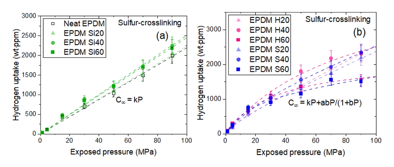 흡착 모델을 따른다. 카본 블랙이 함유된 EPDM 복합체에서의 수소 흡수는 고분자 네트워크에 의한 흡수와 카본 블랙 충전제에 의한 흡착의 기여를 받는다.