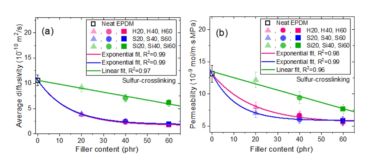 그림 8에서 볼 수 있듯이, 실리카 충전제가 포함된 EPDM 복합체에서 확산도/투과도 사이에는 음의 선형 관계(P = -밀도)가 나타났으며, 이는 충전제