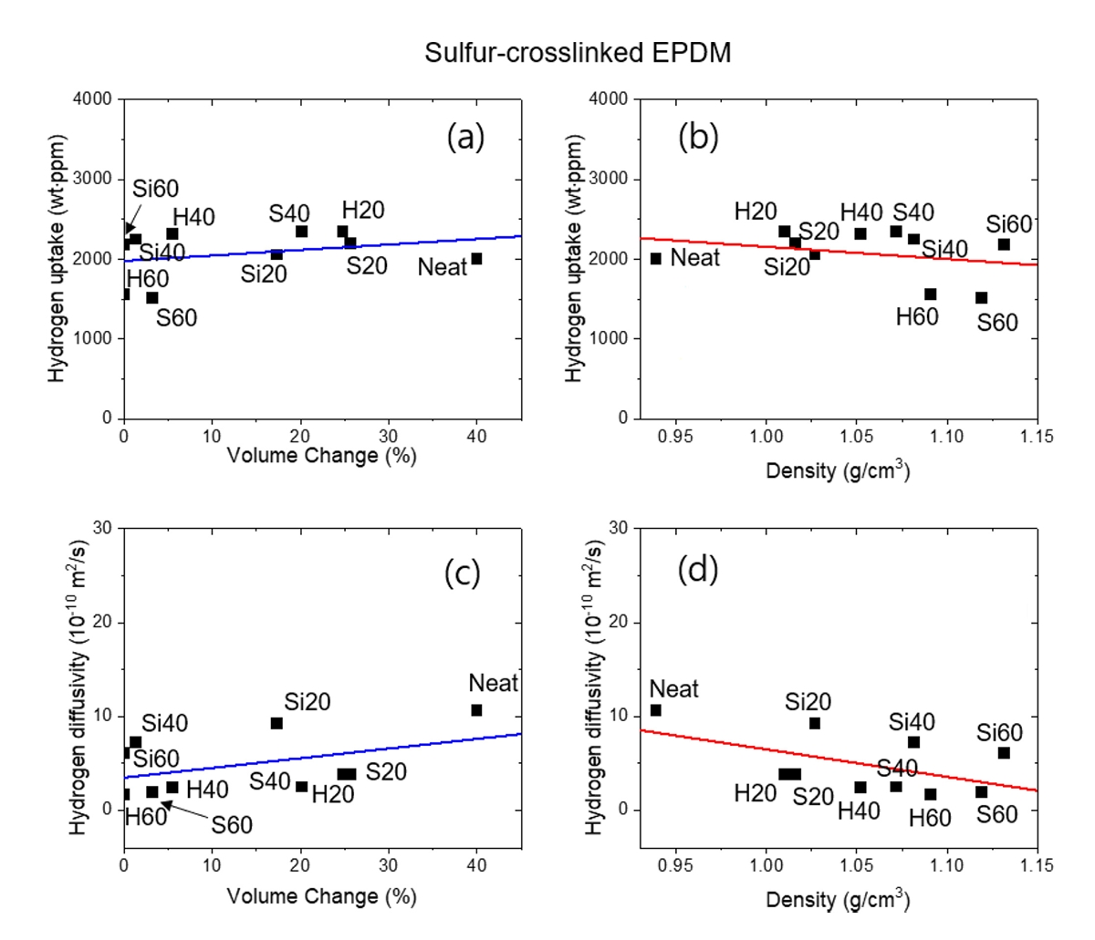 물리적 물성(부피와 밀도)의 변화율 측정과 수소 충전량과 확산도와의 관련성을 조사하기 위해서 앞서 90 MPa 조건에서 얻은 수소 충전량(그림 7)과 확산도 결과(그림 8)를 시편 종류에 따른 충전 전후의 부피 변화율(그림 6의 중간)과 밀도 변화율(그림 6의 오른편)에 대해 최소자승 회귀분석을 하였다. 그림 9 순수 EPDM과 황으로 가교된 EPDM 복합체의 부피와 밀도 변화에 따른 수소 장입량과 확산도 변화를 나타낸다. 그림 9(a)와 (c)에서 볼 수 있듯이, EPDM 복합체에서 부피와 수소 충전량과 확산도와 사이에는 양의 선형 관계가 나타났다. 그러나 그림 9(b)와 (d)에서 EPDM 복합체에서 밀도가 수소 장입량과 확산도에 미치는 효과는 충전제 함량에 따라 음의 선형관계가 발견되었다.
