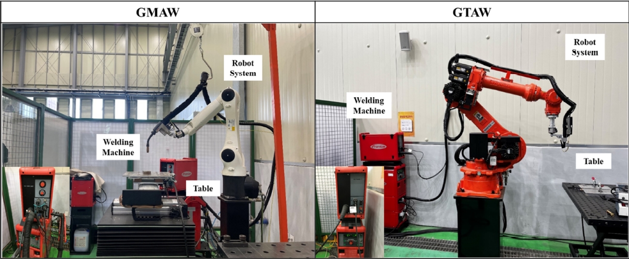 용접기에 현대로보틱스 로봇 시스템을 사용하였다(그림 1). GMAW의 경우 GTAW에 비해 높은 입열 효율을 가진다[20]. 따라서 본 실험에서 2가지 용접 공법에 따른 용접 조건은 입열 계산식에 근거한 각 공법에 따라 입열 효율을 적용하여 설정하였다. 용접 조건은