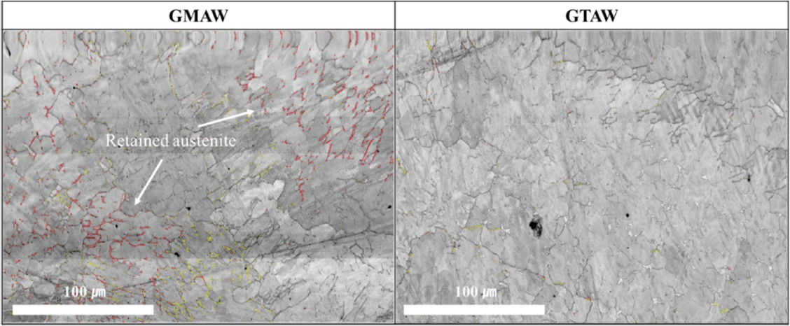 빠른 GMAW 용접부에서는 18.2 %의 잔류 오스테나이트가 관찰 되었으며 이는 급속 냉각으로 인해 오스테나이트가 K-S 및 N-W 관계에 의해 부분적으로
