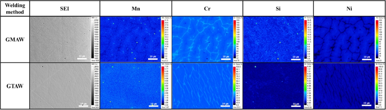 따라 Cr이 국부적으로 농축되어 있는 반면, GTAW 용접부에서는 레시 형태의 δ-페라이트를 따라 Cr이 집중되어 있는 것이 관찰되었다. γ-오스테나이트를