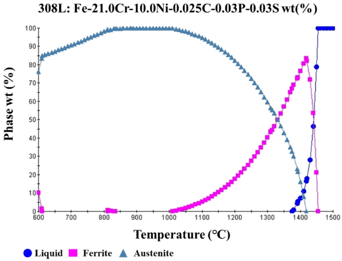 값을 그래프로 나타내었다. 308L 와이어 합금 조성을 기반으로 그래프가 도출되었다. 그림 13에 나타낸 그래프에 의하면 800 oC에서부터 페라이트의 분율이 일부 존재하는 것으로 보아 일부 페라이트 상이 생성된다고 판단된다. GMAW 및 GTAW 공법은 동일한 모재와 두께 조건에서