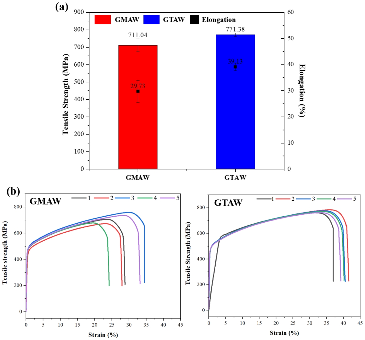 %로 나타났다. 반면, GTAW 공법으로 제작한 시편은 평균 771.38 MPa의 인장강도와 39.13 %의 연신율을 보여, GMAW 공법에 비해