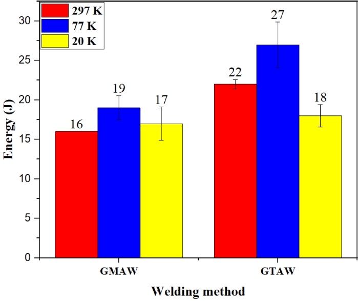 J로 나타났으며, GTAW 공법의 경우 상온에서 22 J, 극저온에서는 27 J로 측정되었다. 두 조건 모두에서 GTAW 용접부가 GMAW 용접부에