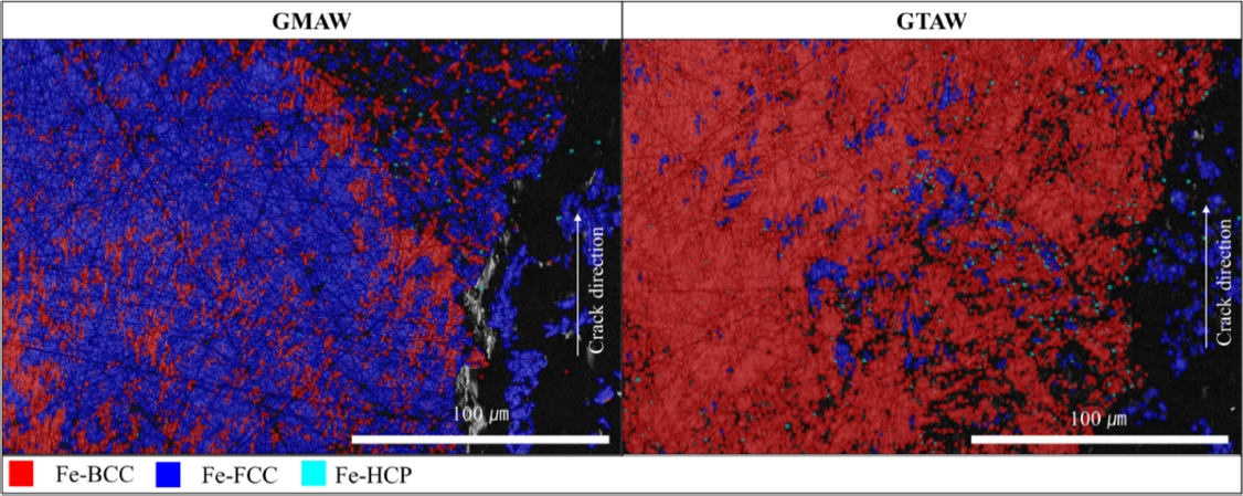 반면, GMAW 용접부에서는 변태되지 않은 γ-오스테나이트가 지배적으로 형성되었으며,이는 해당 용접부가 높은 적층 결함 에너지를 유지하면서 변형 시