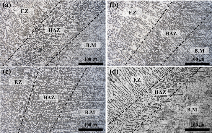 그림 5는 광학 현미경을 이용하여 각 조건에서 용접부 중심을 기준으로 용융부(Fusion Zone, FZ), 열영향부(Heat Affected Zone,