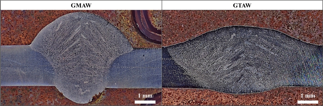 GTAW 공법으로 제작된 시편에서는 비드 면적이 더 넓게 형성되었다. 이는 동일한 이론적 입열량이 적용되었더라도, 아크 특성, 용접 모드, 용접 속도,