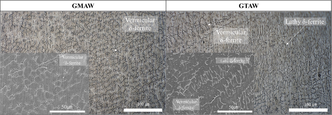 GTAW 용접부가 GMAW 용접부보다 높은 Cr 함유량으로 인해 δ-페라이트가 보다 안정화되어 있음을 시사한다[29].
