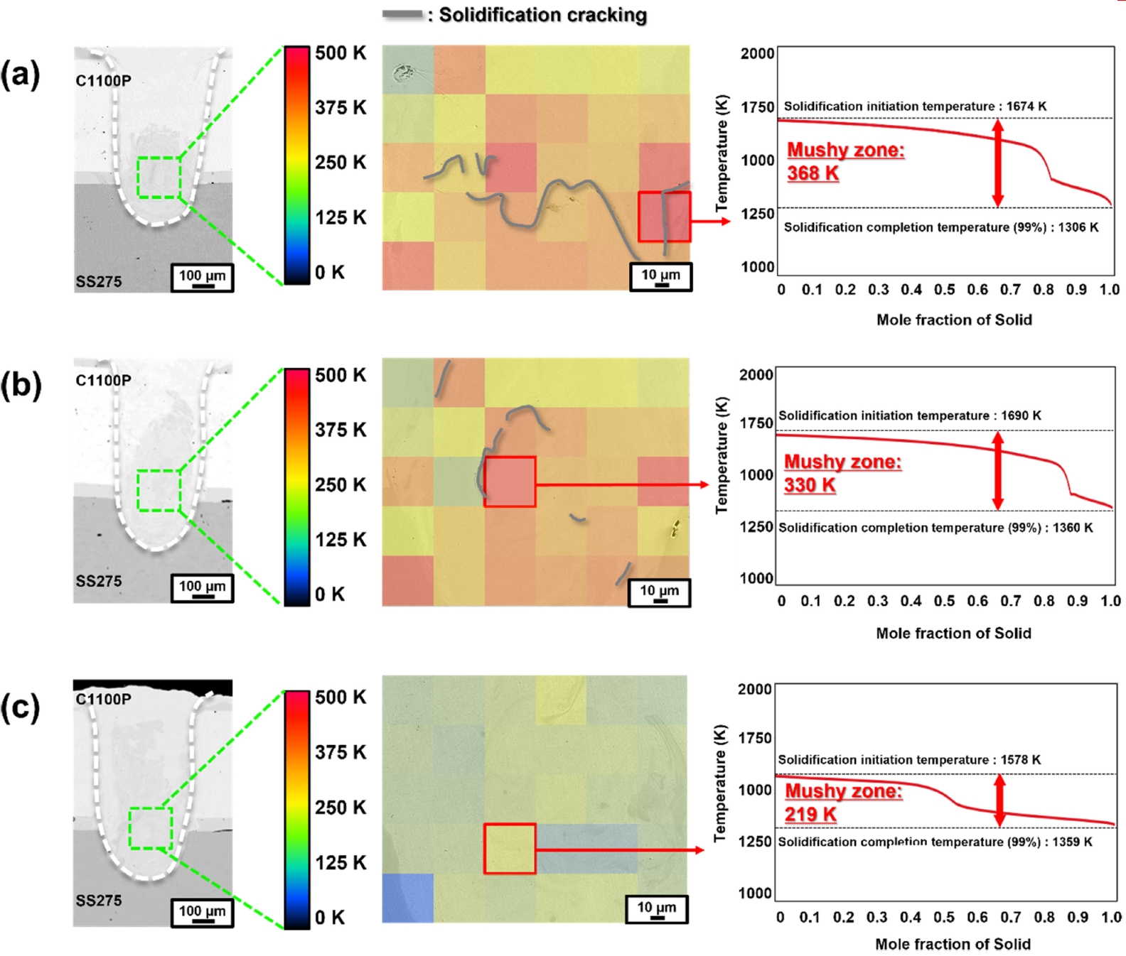 450K의 넓은 용접 응고 온도 범위(Weld Mushy Zone Range)를 가지는 위치에 집중되는 것으로 보고되었다. 더불어 응고균열 발생 시점에는